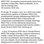 Po drugie. W związku z tym, że w 2020 roku żaden upoważniony zgodnie ze Statutem NSZZ FSG przedstawiciel zarządu oddziałowego NSZZ FSG przy Nadwiślańskim OSG w Warszawie nie uczestniczył w posiedzeniach Zarządu Głównego NSZZ FSG w formie zdalnej lub stacjonarnej, podczas których omawiana była kwestia medali z okazji 30-lecia NSZZ FSG, informuję że: