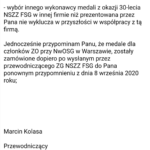 – wybór innego wykonawcy medali z okazji 30-lecia NSZZ FSG w innej firmie niż prezentowana przez Pana nie wyklucza w przyszłości w współpracy z tą firmą.
