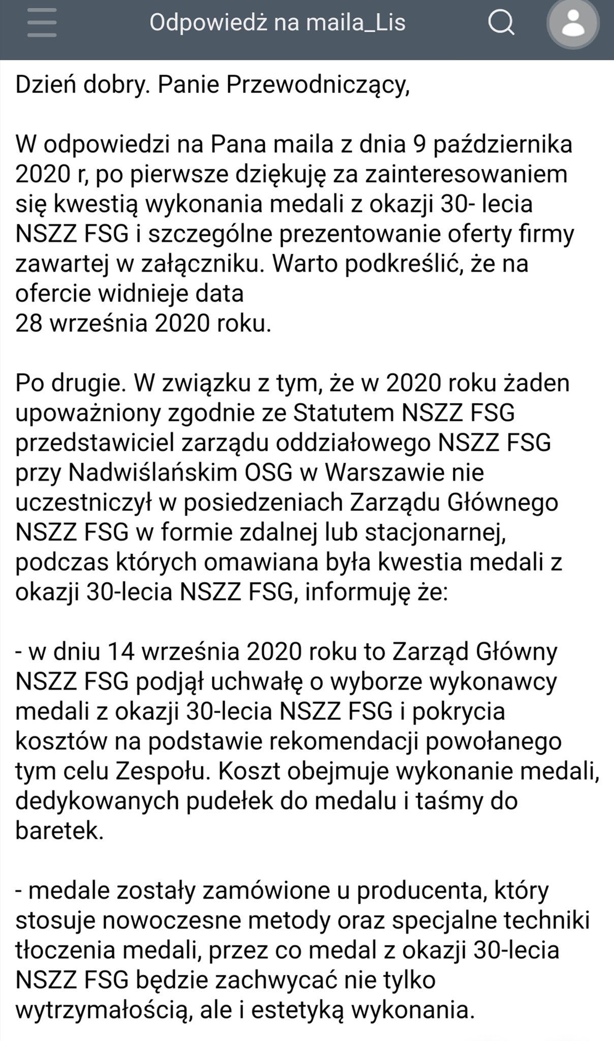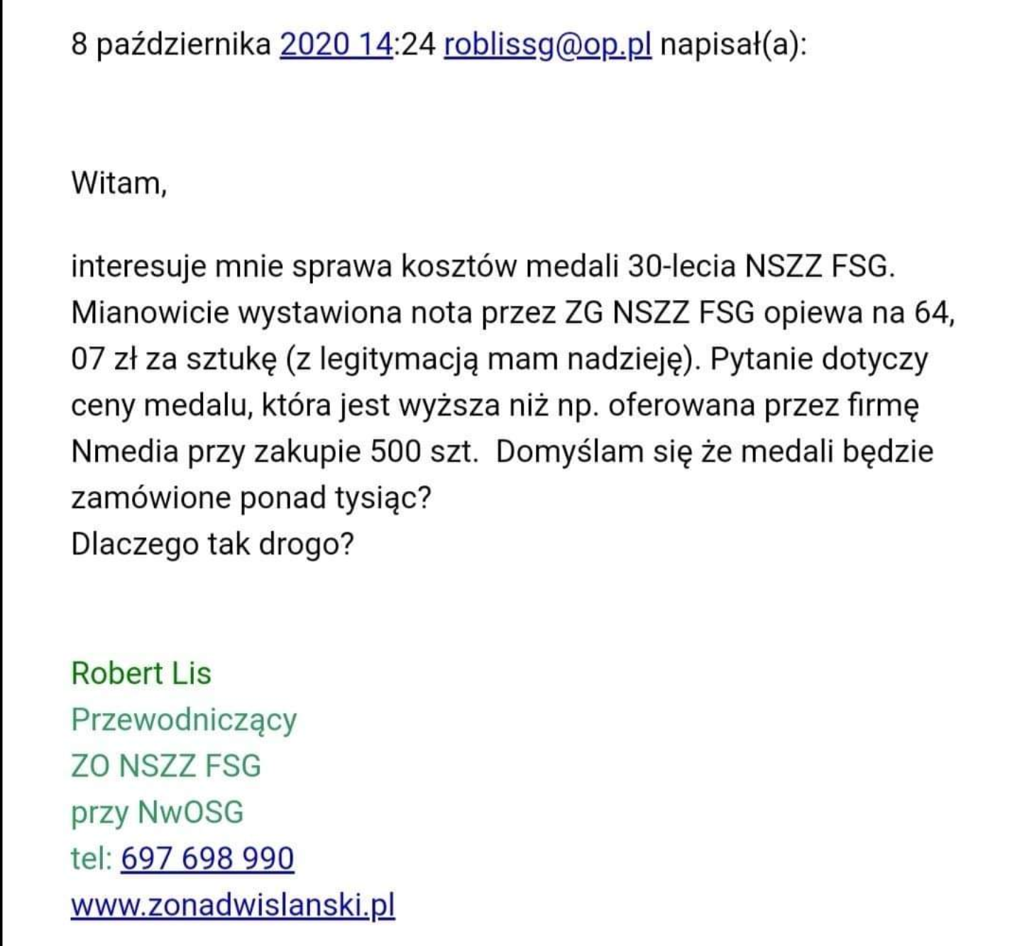 Jednocześnie przypominam Panu, że medale dla członków ZO przy NwOSG w Warszawie, zostały zamówione dopiero po wysłanym przez przewodniczącego ZG NSZZ FSG do Pana ponownym przypomnieniu z dnia 8 września 2020 roku;