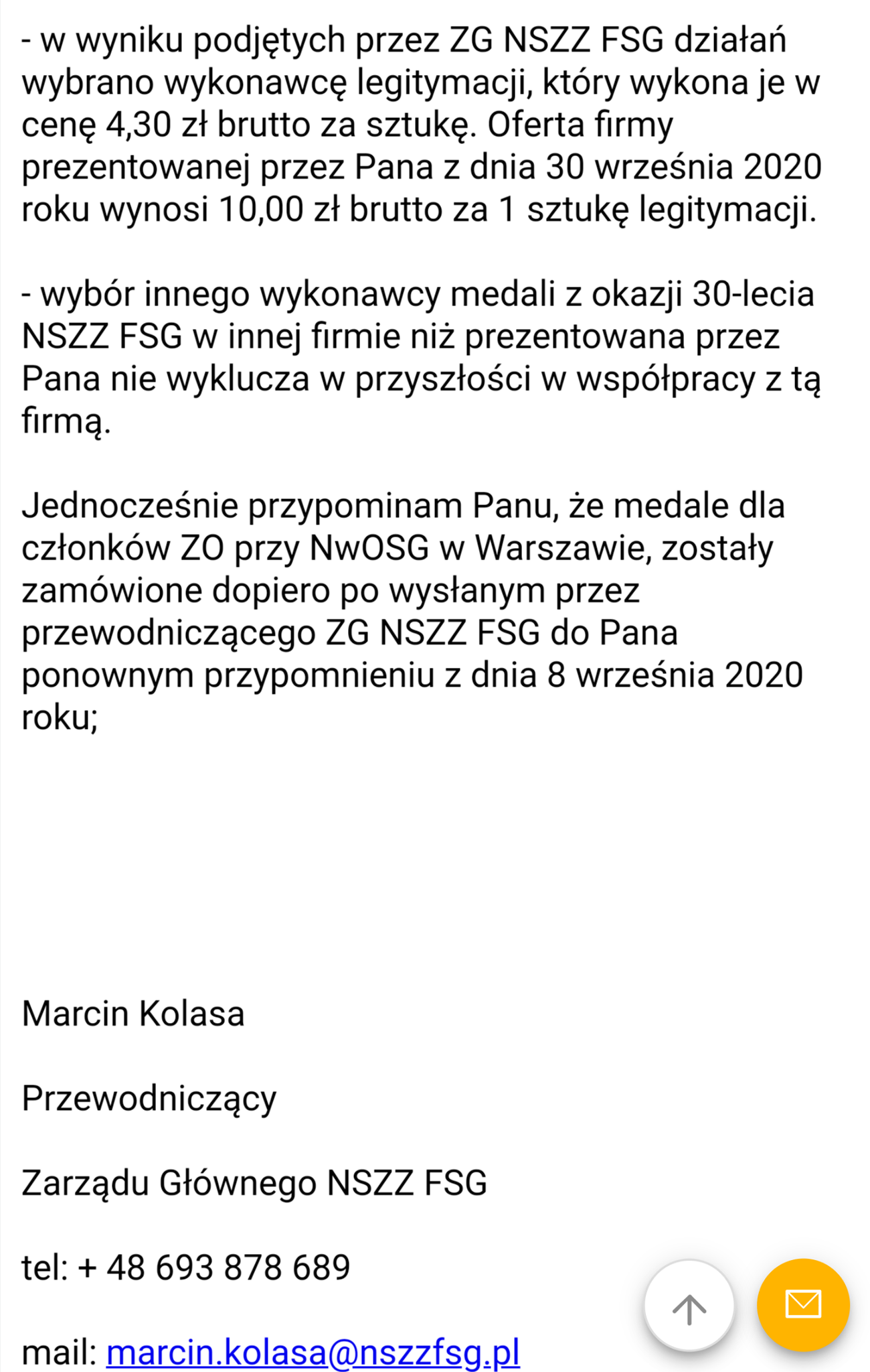 – w wyniku podjętych przez ZG NSZZ FSG działań wybrano wykonawcę legitymacji, który wykona je w cenę 4,30 zł brutto za sztukę. Oferta firmy prezentowanej przez Pana z dnia 30 września 2020 roku wynosi 10,00 zł brutto za 1 sztukę legitymacji.
