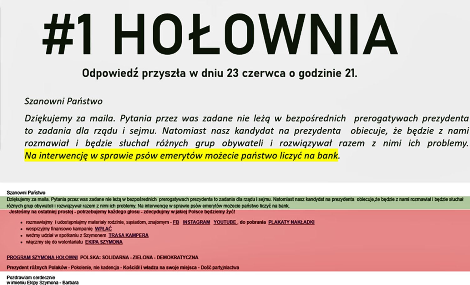 „Szanowni Państwo Dziękujemy za maila. Pytania przez was zadane nie leżą w bezpośrednich prerogatywach prezydenta to zadania dla rządu i sejmu. Natomiast nasz kandydat na prezydenta obiecuje,że będzie z nami rozmawiał i będzie słuchał różnych grup obywateli i rozwiązywał razem z nimi ich problemy. Na interwencję w sprawie psów emerytów możecie państwo liczyć na bank”.