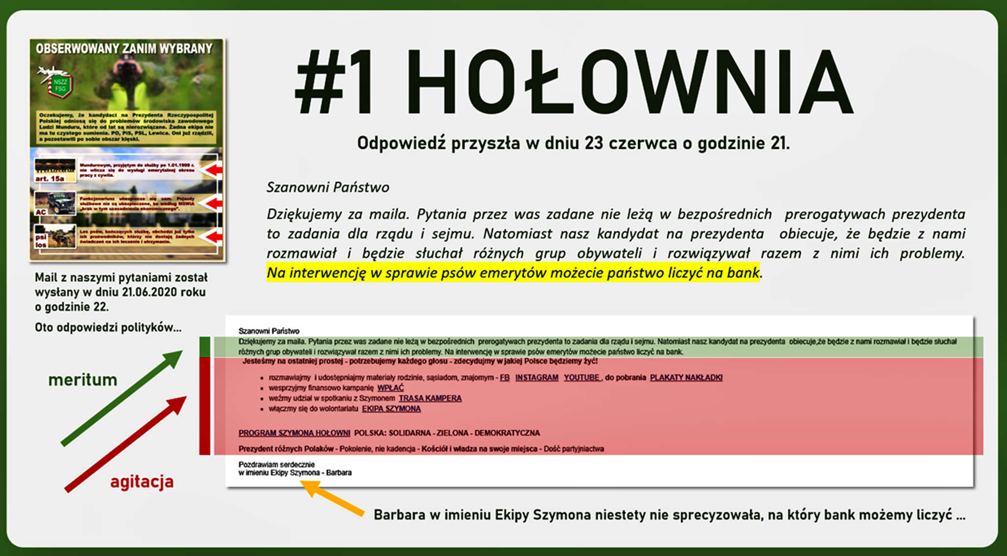 „Szanowni Państwo Dziękujemy za maila. Pytania przez was zadane nie leżą w bezpośrednich prerogatywach prezydenta to zadania dla rządu i sejmu. Natomiast nasz kandydat na prezydenta obiecuje,że będzie z nami rozmawiał i będzie słuchał różnych grup obywateli i rozwiązywał razem z nimi ich problemy. Na interwencję w sprawie psów emerytów możecie państwo liczyć na bank”.