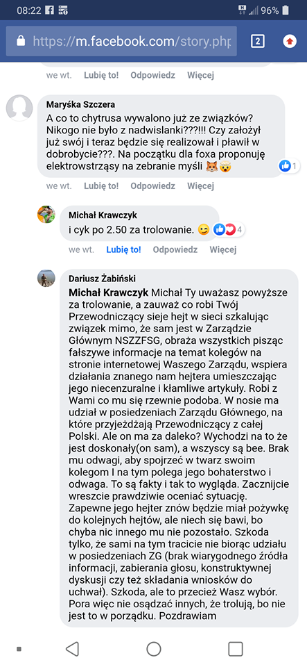 Jeśli według pana Żabińskiego, takie zachowanie przystoi oficerowi starszemu, piastującemu eksponowane stanowisko funkcyjne w Związku, to już jest jego sprawa. Ja, będąc administratorem publicznego profilu, funkcjonującego z upoważnienia kierowanej przeze mnie organizacji oddziałowej, nie zamierzam tolerować tego rodzaju sytuacji.