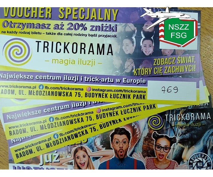 Największe w Polsce Centrum Iluzji Trickorama w Radomiu współpracujące z ZO NSZZ FSG przy NwOSG zaprasza funkcjonariuszy i pracowników naszego oddziału do korzystania ze swoich atrakcji z 20-procentowym rabatem na bilet wstępu (po okazaniu vouchera).