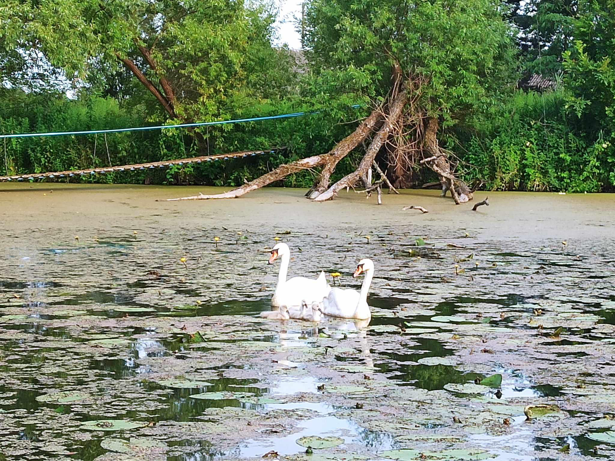 Domek nr 4. Zacieniony domek z kominkiem położony 3 metry od stawu, częściowo schowany w zasadzonym przez gospodarzy lesie. Domek jest wysoki, dwupiętrowy. Na piętrze z widokiem na stawy znajdują się dodatkowe miejsca do spania dla gości, którym nie straszne wspinanie po kilku schodkach. Konstrukcja drewniana, wykonany z bali o powierzchni ok 43 m2. Wyposażony w pełen węzeł sanitarny oraz aneks kuchenny. W domku znajduje się lodówka i TV, Duży taras należący do domku to idealne miejsce na posiłki w cieniu w gronie przyjaciół i rodziny. Domek maksymalnie może gościć 6 osób (pojedyncze łóżka).