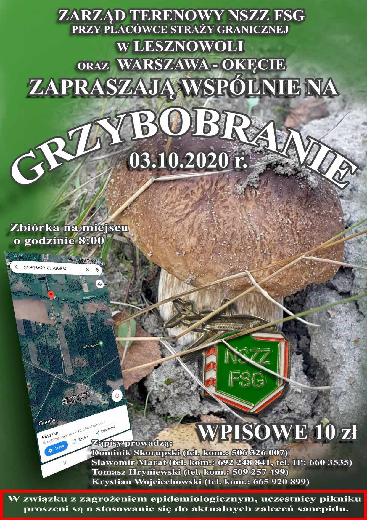 Zarząd Terenowy NSZZ FSG przy PSG Warszawa Okęcie i przy PSG Lesznowola zaprasza na grzybobranie w dniu 3 października br.