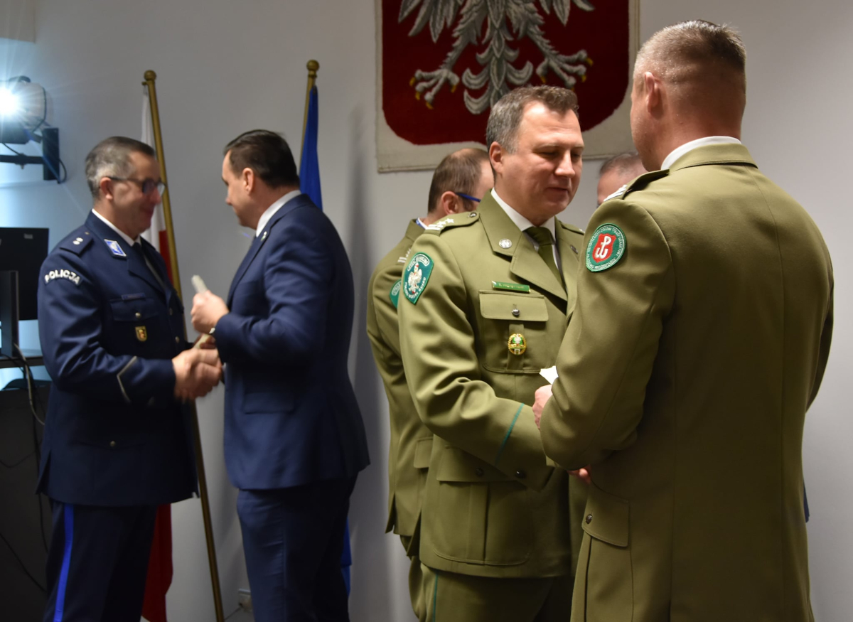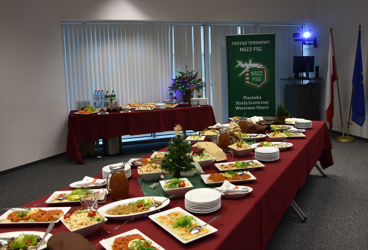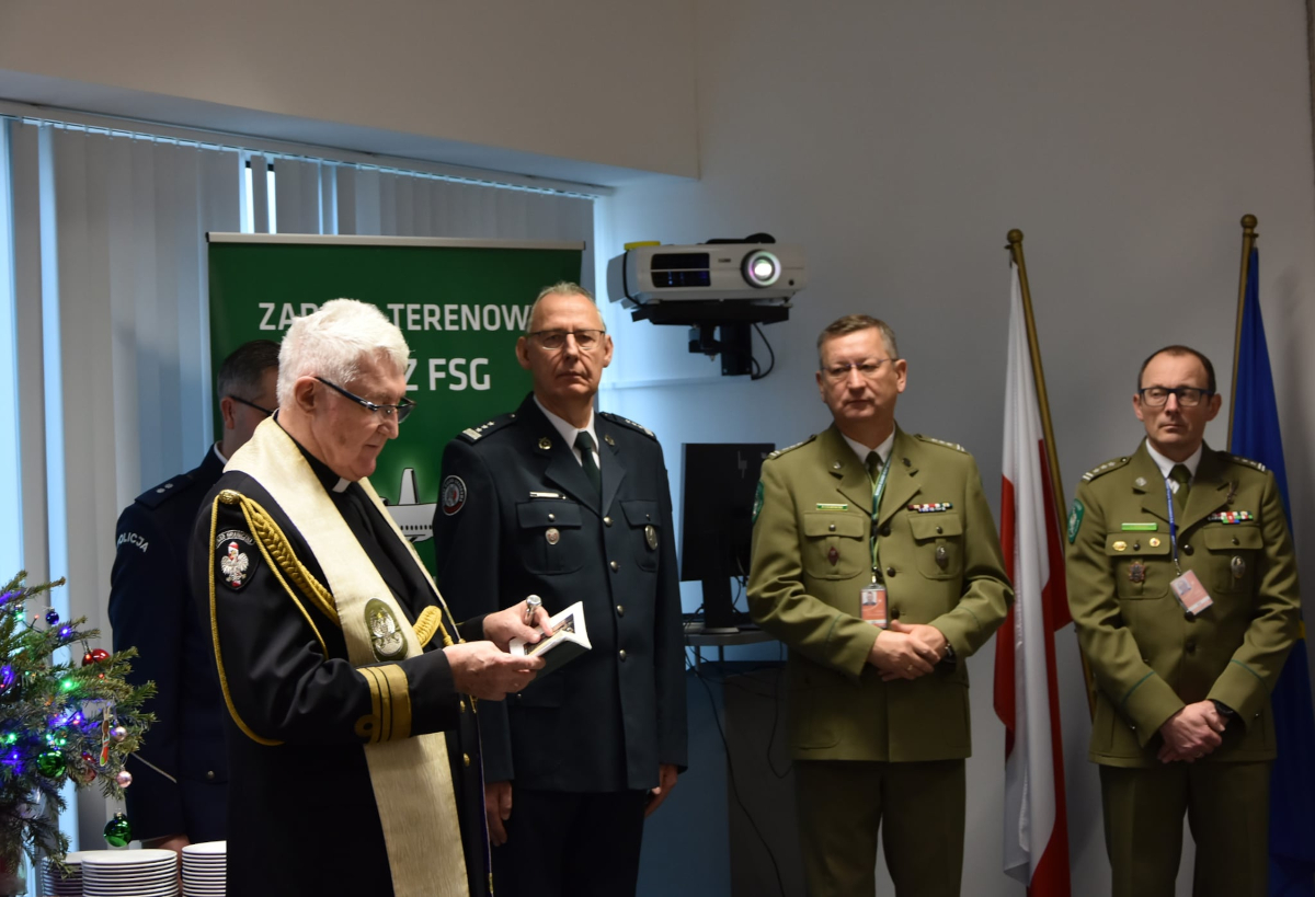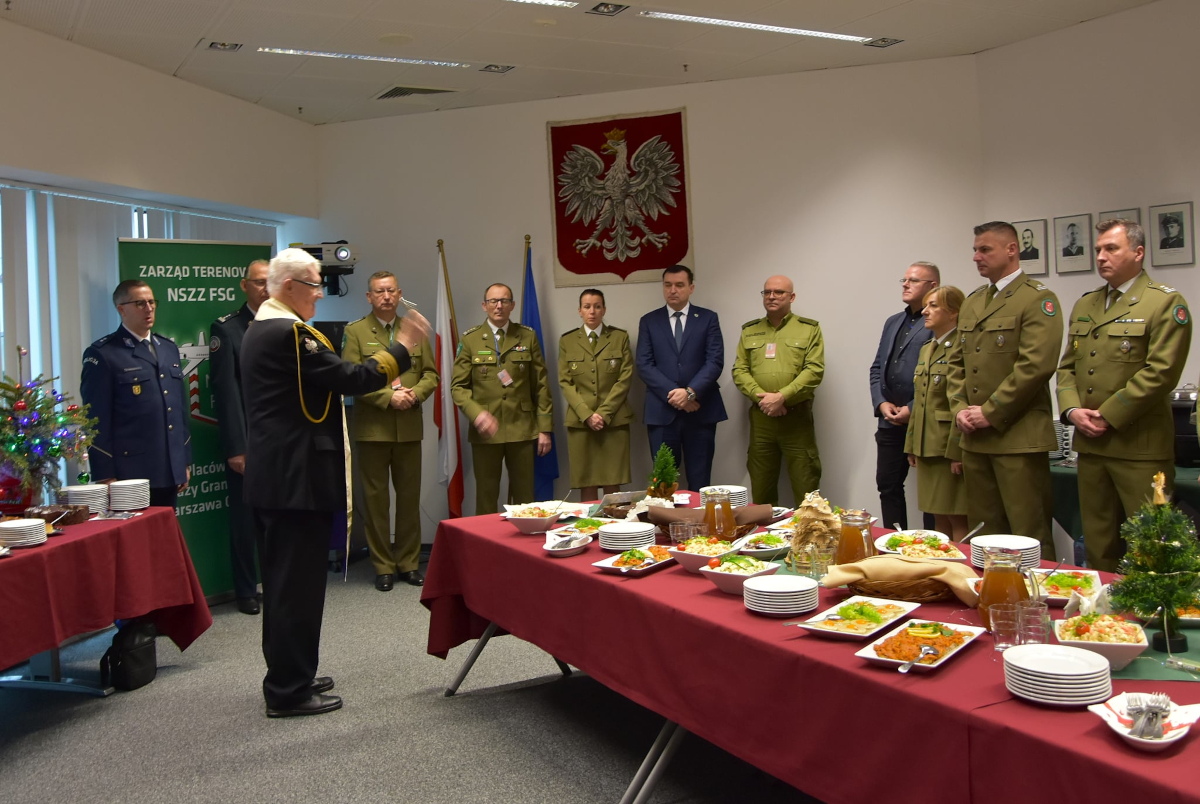 Bożonarodzeniowe i noworoczne życzenia spokoju, zdrowia oraz wszelkiej pomyślności przekazali: Zastępca Komendanta Nadwiślańskiego Oddziału Straży Granicznej płk SG Jarosław Siergiej, Komendant Placówki Straży Granicznej Warszawa-Okęcie płk SG Piotr Czarnecki, wiceprzewodniczący Zarządu Oddziałowego NSZZ FSG przy NwOSG Paweł Matuszewski oraz przewodniczący Zarządu Terenowego NSZZ FSG przy PSG Warszawa-Okęcie Krystian Wojciechowski.