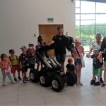 Kolejnym punktem wycieczki było spotkanie z przedstawicielami Straży Granicznej. Funkcjonariusze przygotowali wiele atrakcji: pokaz samochodu służbowego, sprzęt, którego zadaniem jest ujawnienie odbitek śladów daktyloskopijnych, pokaz broni służbowej, wspaniały pokaz specjalistycznego sprzętu wykorzystywanego w służbie min. robota pirotechnicznego, którego zadania na lotnisku są istotne i dotyczą bezpieczeństwa a spotkanie z nietypowym funkcjonariuszem pracującym na lotnisku – psem służbowym przyniosło dzieciom wiele radości.