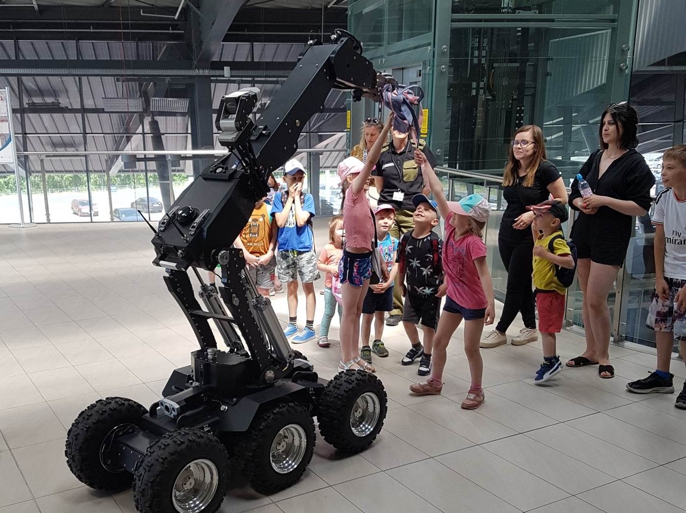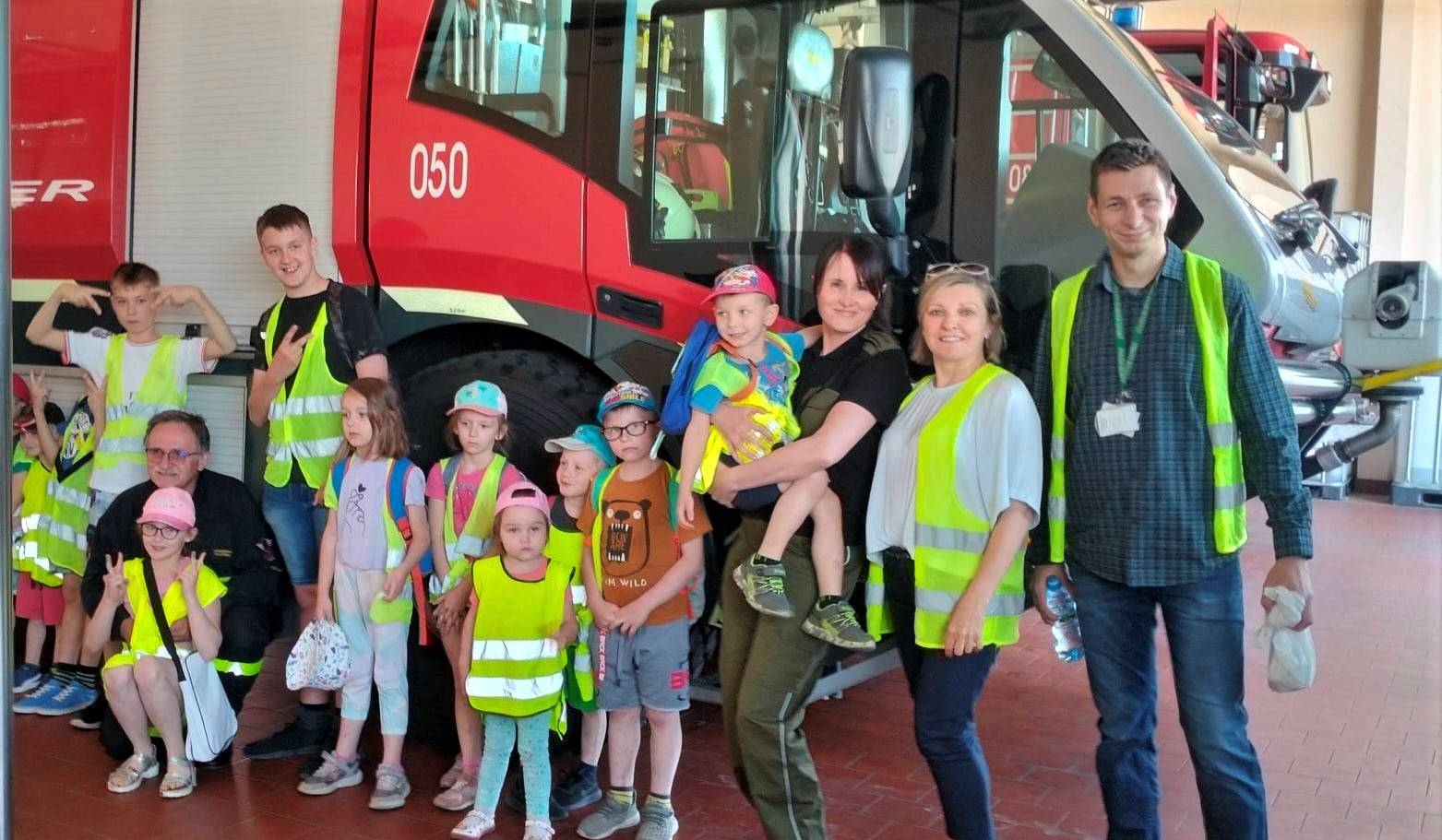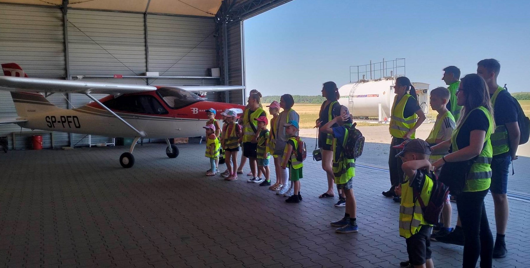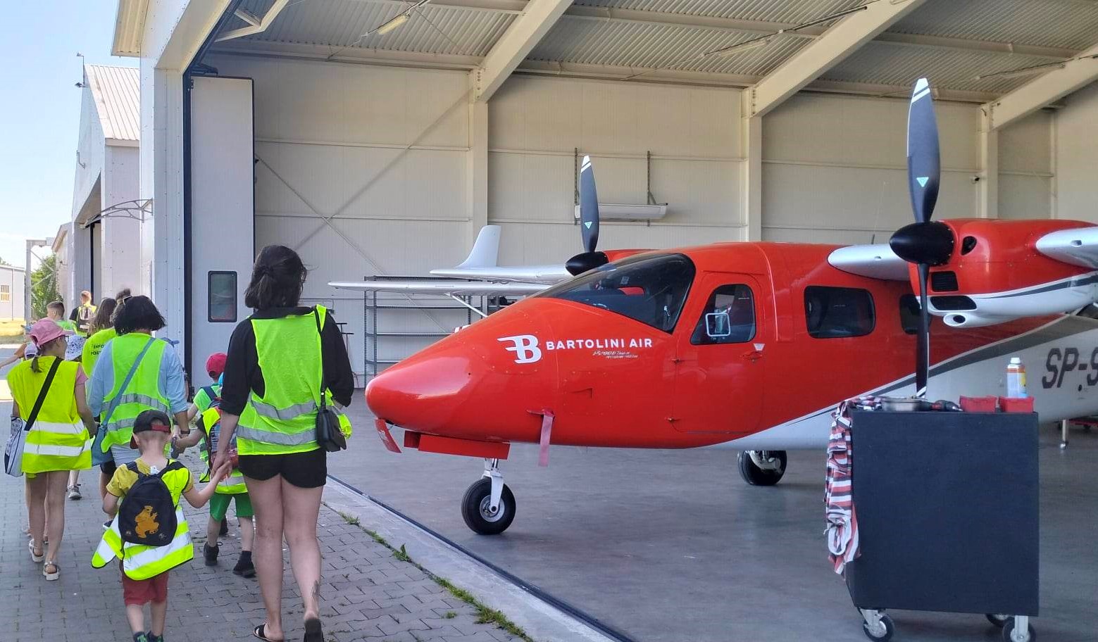 Następnie wszyscy uczestnicy poddali się kontroli bezpieczeństwa i zaopatrzeni w kamizelki odblaskowe podziwiali teren lotniska autobusem, który najpierw zawiózł dzieci do hangarów Barlolini Air, a później do Lotniskowej Straży Pożarnej.
