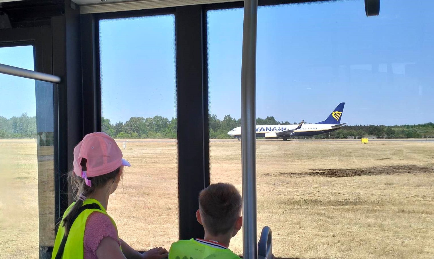 Następnie dzieci obserwowały start samolotu rejsowego linii Ryanair najbliżej jak się dało, z pozycji pasa startowego. Uśmiech i zadowolenie na twarzy dzieci były ogromne.