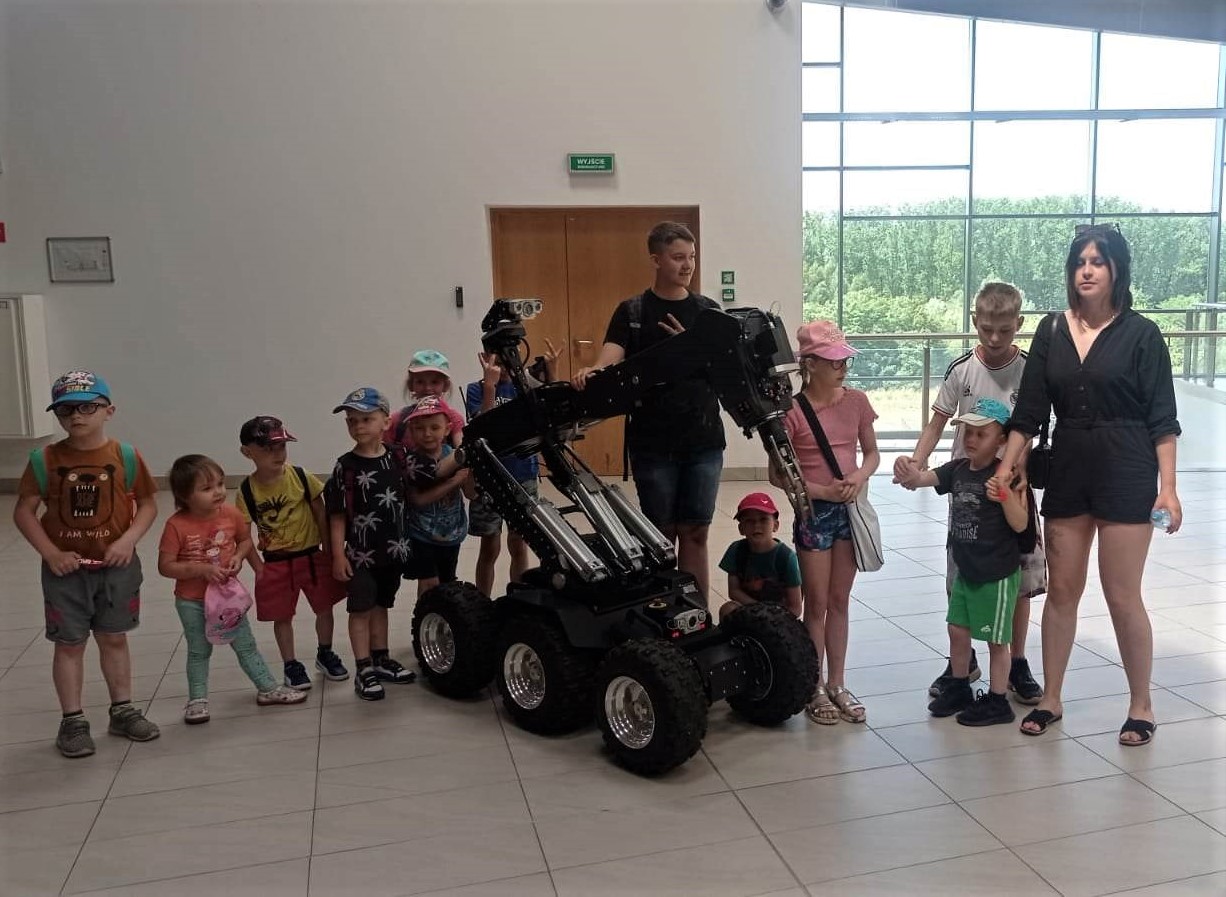 Kolejnym punktem wycieczki było spotkanie z przedstawicielami Straży Granicznej. Funkcjonariusze przygotowali wiele atrakcji: pokaz samochodu służbowego, sprzęt, którego zadaniem jest ujawnienie odbitek śladów daktyloskopijnych, pokaz broni służbowej, wspaniały pokaz specjalistycznego sprzętu wykorzystywanego w służbie min. robota pirotechnicznego, którego zadania na lotnisku są istotne i dotyczą bezpieczeństwa a spotkanie z nietypowym funkcjonariuszem pracującym na lotnisku – psem służbowym przyniosło dzieciom wiele radości.