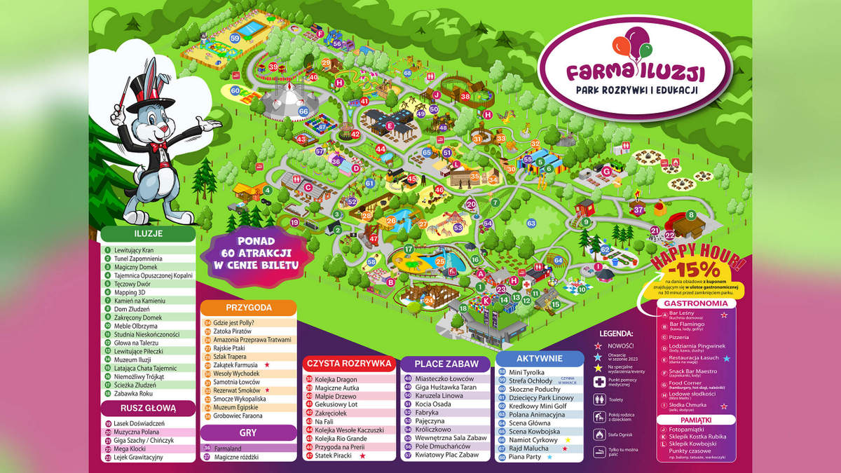 Edukacyjny Park Rozrywki Farma Iluzji pod Warszawą to wyjątkowa atrakcja, która łączy niezwykły klimat świata czarodziejów z rozrywką pełną nauki, iluzji i zaskakujących zjawisk. Goście mogą tu skorzystać z kilkudziesięciu unikalnych atrakcji, takich jak Latająca Chata Tajemnic, Dom Złudzeń, Kopalnia Złota czy Zaklęty Młyn. Park stawia na naukę poprzez zabawę, rozwijając ciekawość, kreatywność i wyobraźnię najmłodszych. Rodziny mogą wspólnie przeżywać przygody, integrować się