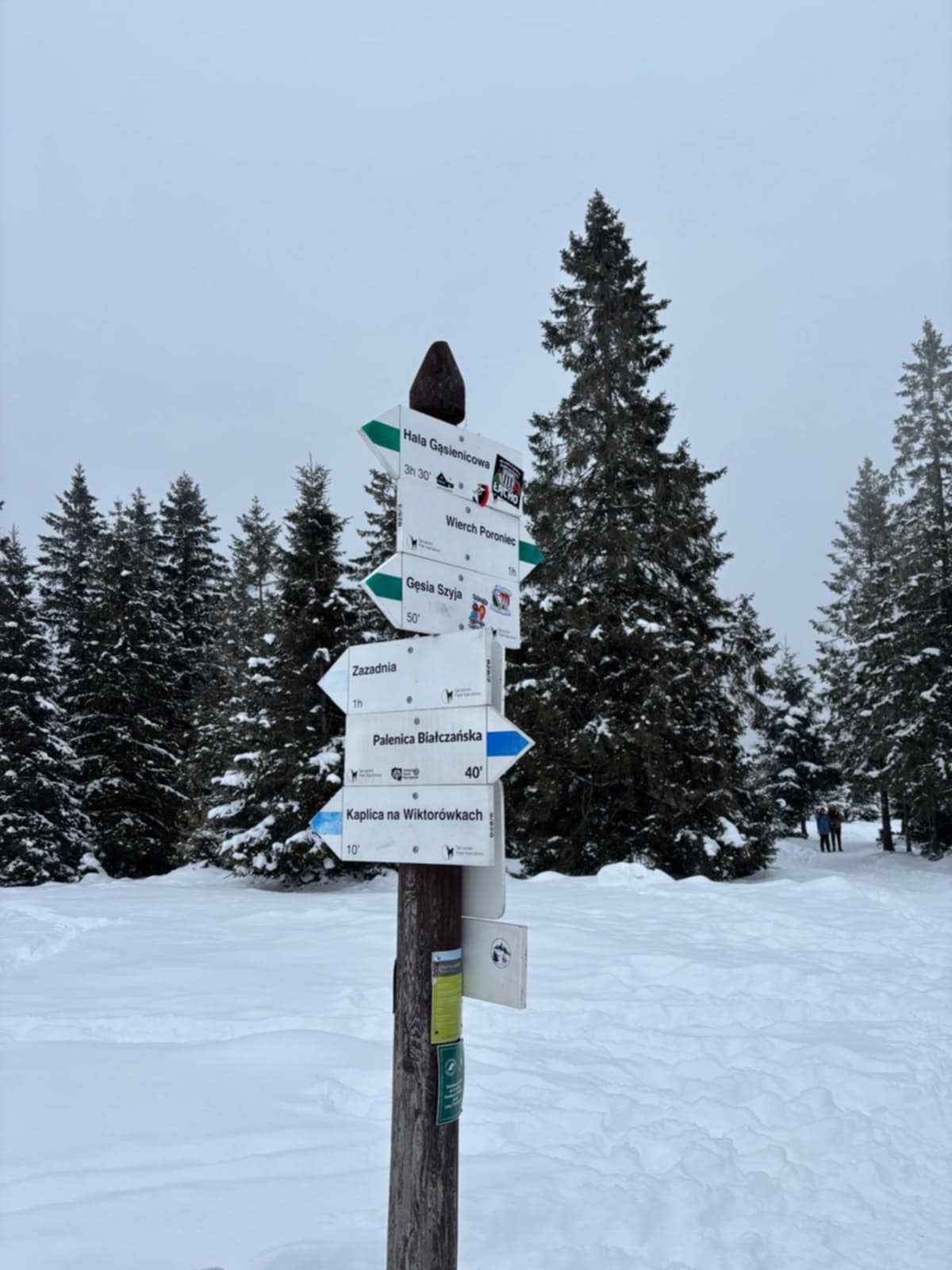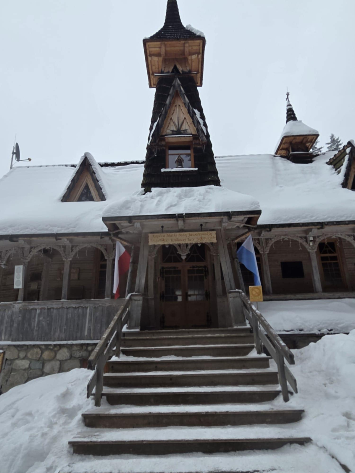 W sobotę po śniadaniu wybraliśmy się na szczyt Gęsia Szyja (1489 m.n.p.m.) – to popularne wzniesienie w Tatrach Wysokich. Nazwa pochodzi od charakterystycznego, wygiętego grzbietu przypominającego gęsią szyję. Pogoda była dla koneserów, ale brak słońca rekompensowała piękna zimowa aura gór. Trasa, którą wybraliśmy prowadziła przez Wiktorówki – Sanktuarium Matki Bożej Jaworzyńskiej Królowej Tatr. Jest to drewniany kościółek prowadzony przez ojców dominikanów. Wiktorówki to ważne miejsce kultu religijnego, znane z tradycyjnej Pasterki oraz symbolicznego cmentarza ofiar gór, który znajduje się w murze wokół kościółka.