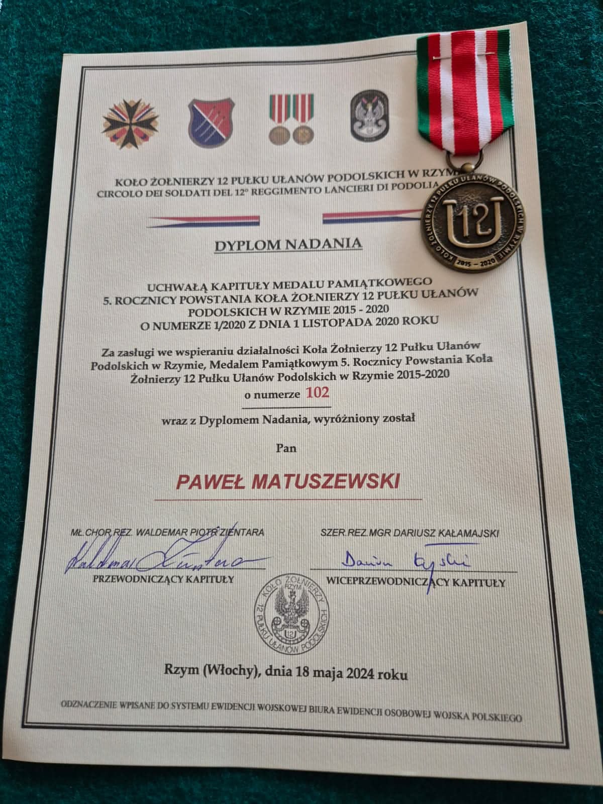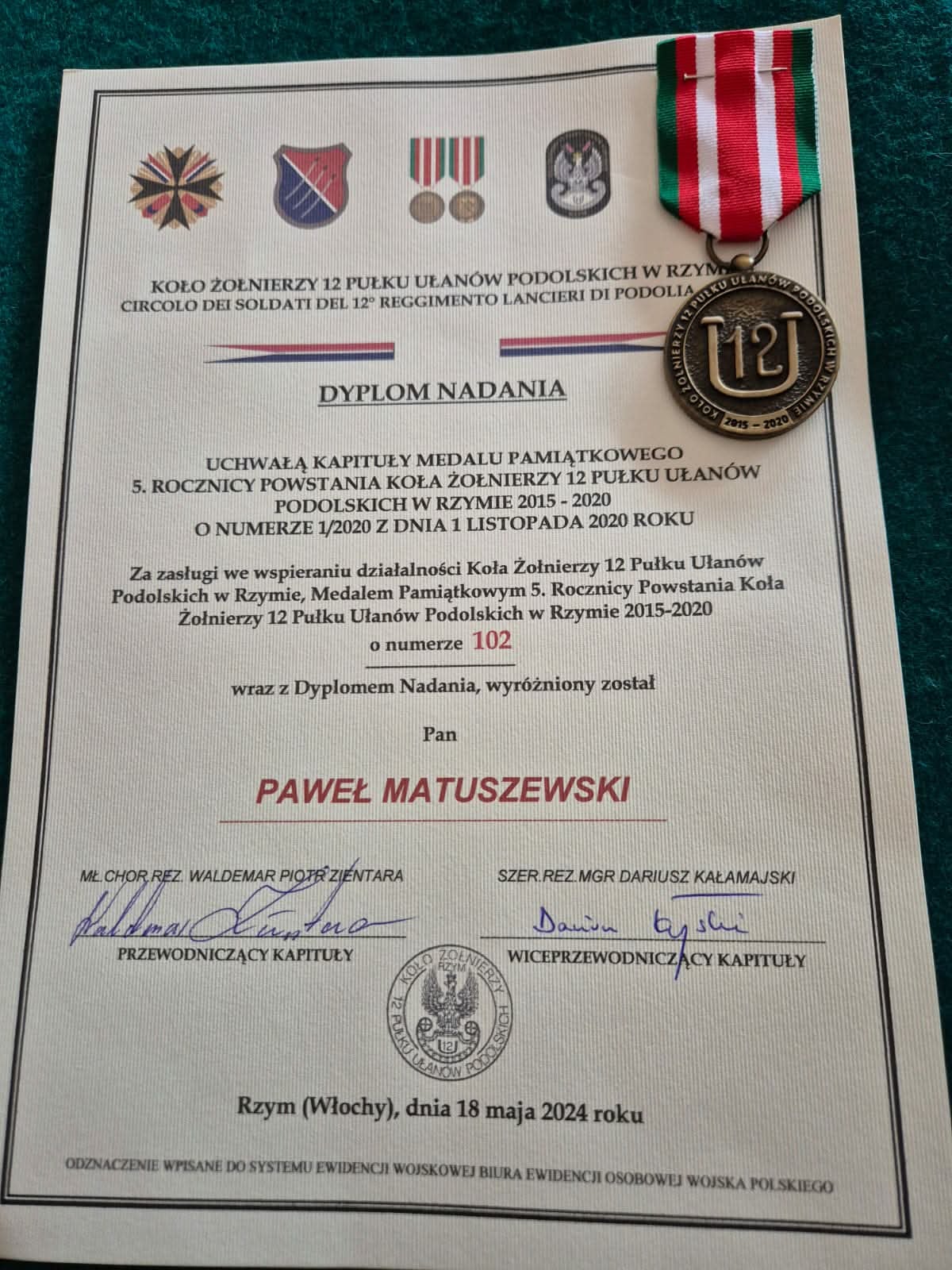 Natomiast Prezes Stowarzyszenia odznaczył wiceprzewodniczących Pawła Matuszewskiego i Marka Zasima medalem pamiątkowym 5. Rocznicy Powstania Koła Żołnierzy 12 Pułku Ułanów Podolskich w Rzymie.