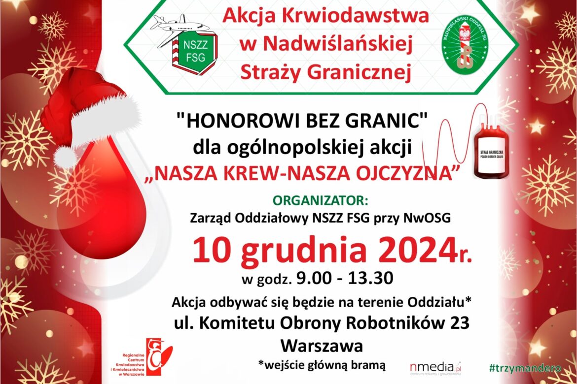 10 grudnia br. odbędzie się ostatnia w tym roku zbiórka krwi organizowana przez Zarząd Oddziałowy NSZZ FSG przy NwOSG. „Honorowi Bez Granic” włączają się w 13. edycję ogólnopolskiej akcji honorowego oddawania krwi pod hasłem „Nasza Krew – Nasza Ojczyzna”.