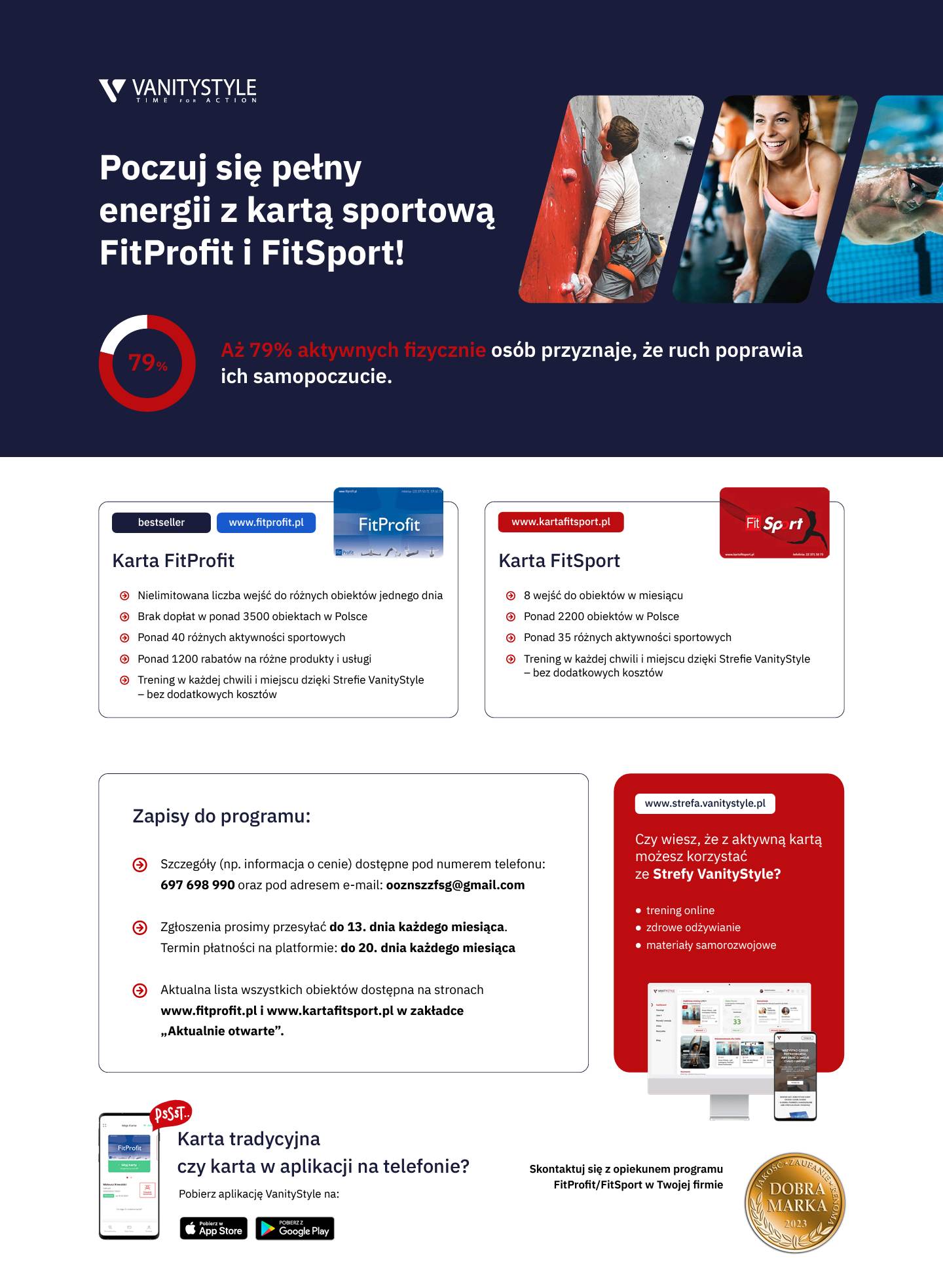 Zapraszamy wszystkich członków ZO NSZZ FSG przy NwOSG do składania zapisów na karty sportowe FitProfit i FitSportktóre oferuje współpracująca z nami spółka VanityStyle świadcząca usługi w zakresie świadczeń pozapłacowych.