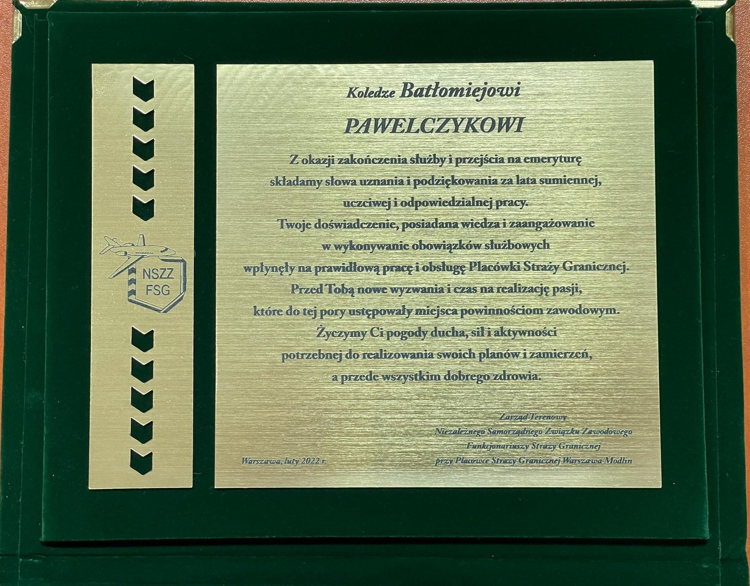 W dniu 25 lutego br. Bartłomiej Pawelczyk, nasz Kolega z ZT NSZZ FSG przy PSG Warszawa Modlin przeszedł na emeryturę.
