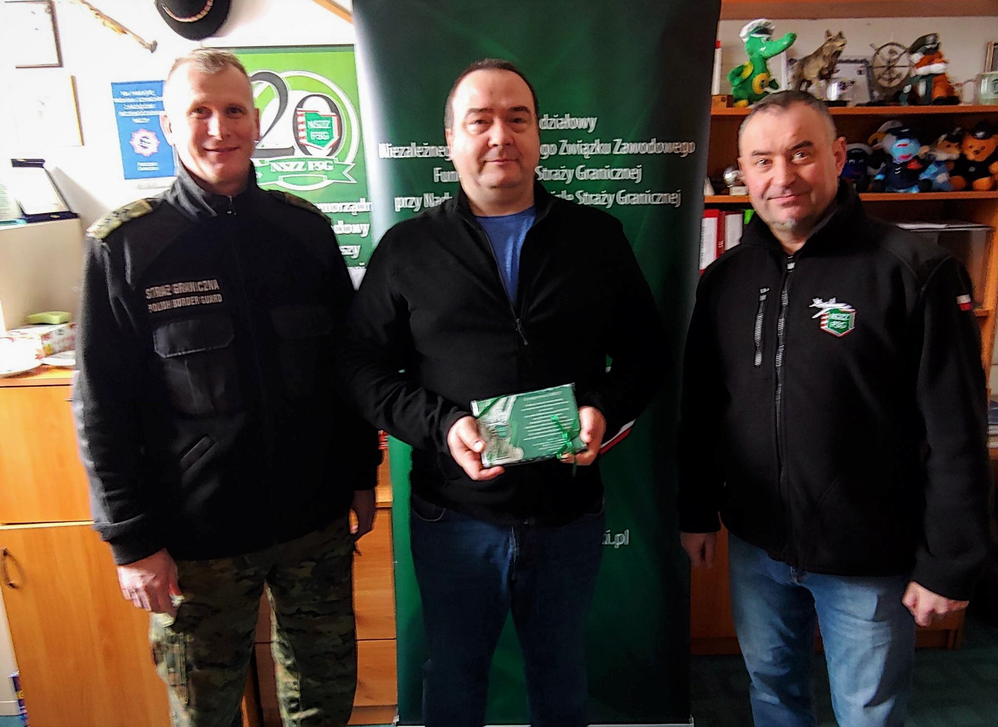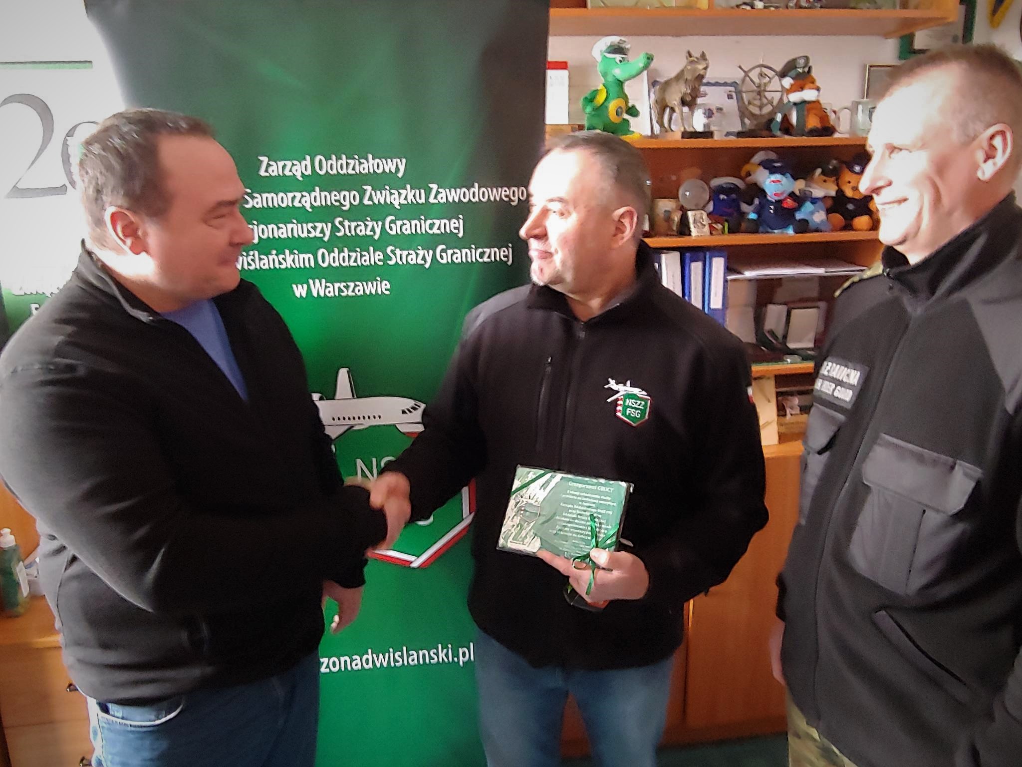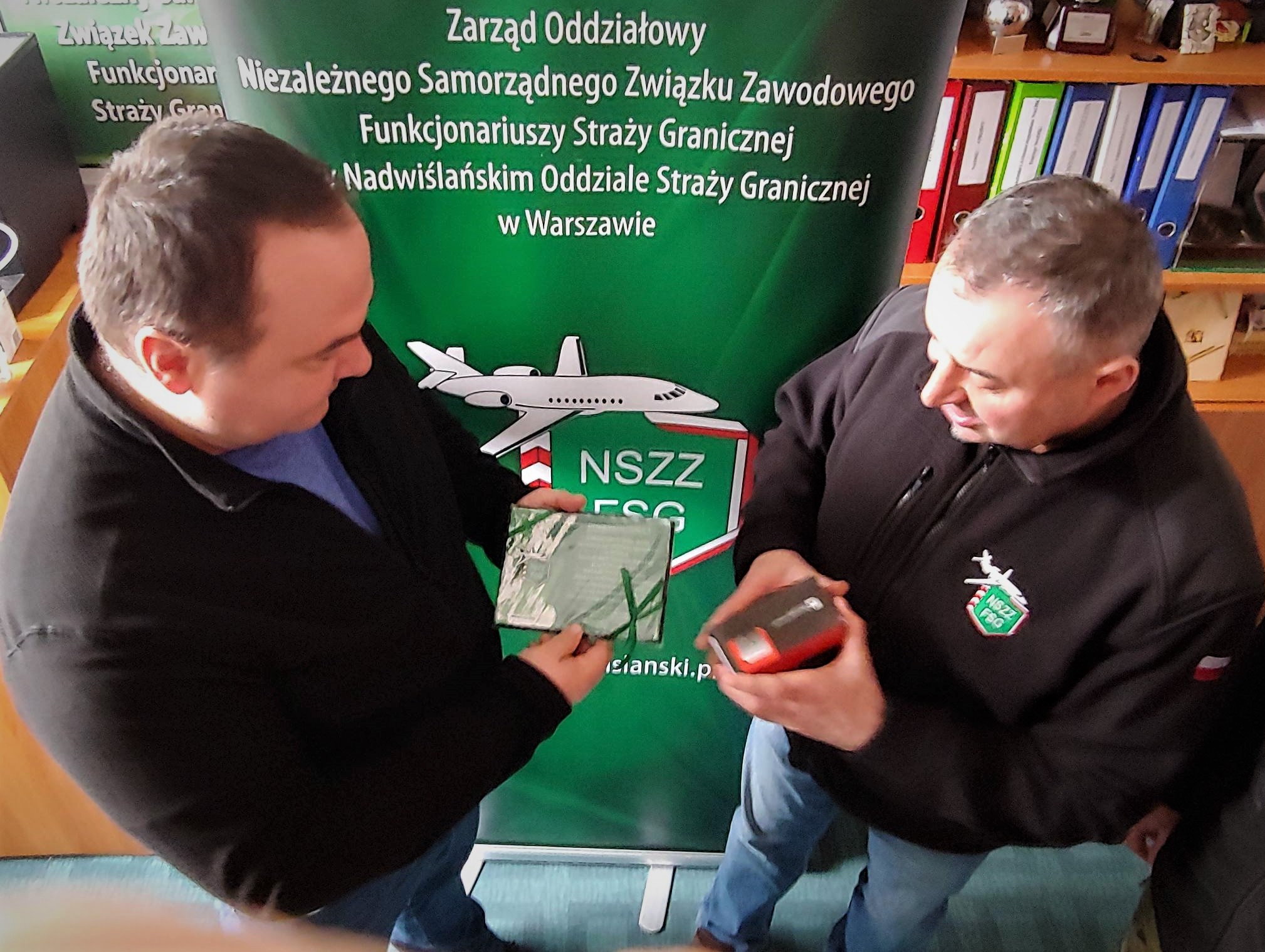 Przewodniczący ZO NSZZ FSG przy NwOSG wraz z wiceprzewodniczącym Markiem Zasimem wręczyli szanownemu koledze pamiątkowy ryngraf i upominek w podziękowaniu za wieloletnią działalność związkową i ogrom pracy na rzecz funkcjonariuszy.