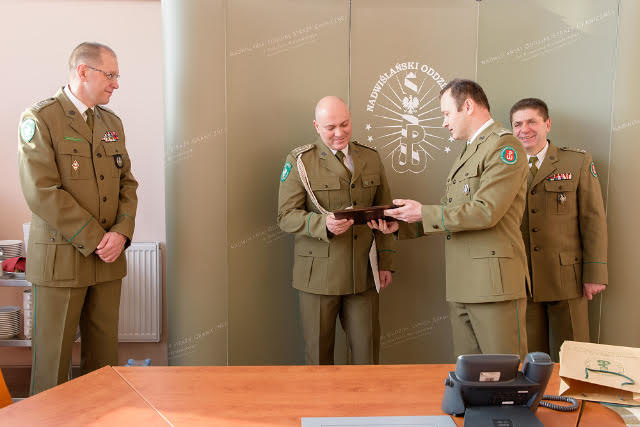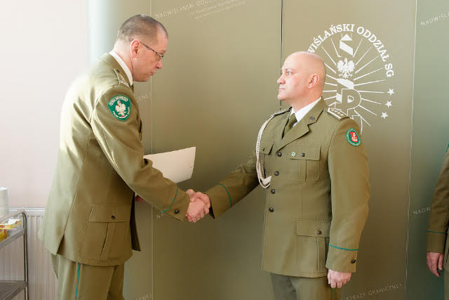 Podczas uroczystego spotkania Komendant Nadwiślańskiego Oddziału Straży Granicznej płk SG Andrzej Rytwiński wraz zastępcą płk. SG Zbigniewem Bartnickim podziękował odchodzącemu funkcjonariuszowi za lata wzorowej i oddanej służby, życząc pomyślności na dalszym etapie życia. Nie zabrakło także podziękowań i życzeń ze strony funkcjonariuszy i współpracowników z wydziału. Na okoliczność pożegnania, odchodzącemu koledze wręczyli wydziałowe tablo ze swoimi wizerunkami oraz pamiątkową atrapę 100 mm naboju artyleryjskiego wykonanego specjalnie na tę okazję. Uroczystość zakończył słodki poczęstunek i wspólna fotografia.