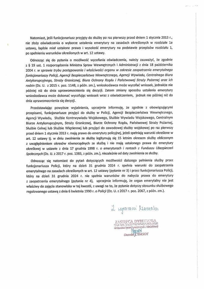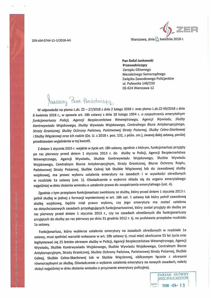 ZER udzielił odpowiedzi na pytania ZG NSZZ Policjantów w sprawie art. 18h ustawy z dnia 18 lutego 1994 roku o zaopatrzeniu emerytalnym funkcjonariuszy Policji, Urzędu Ochrony Państwa, Straży Granicznej, Państwowej Straży Pożarnej i Służby Więziennej oraz ich rodzin.