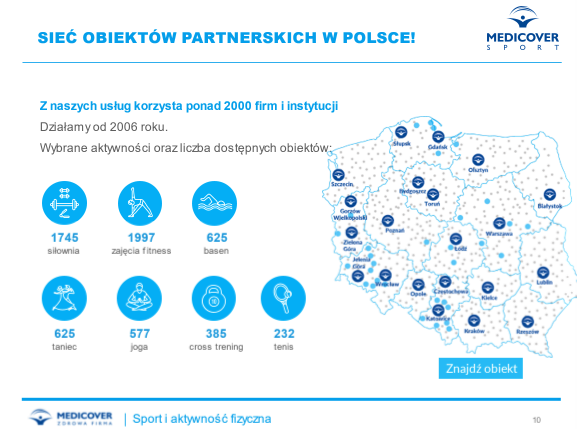 Medicover Sport jest firmą wyspecjalizowaną w sprzedaży usług dla poprawy kondycji fizycznej, rekreacji, zdrowia i urody. Podejmujemy współpracę partnerską ze starannie wybranymi firmami na terenie całego kraju, świadczącymi usługi wysokiej jakości w zakresie: sportu i rekreacji, kultury i rozrywki, poprawy zdrowia i urody.