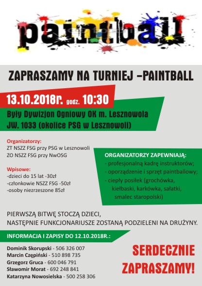 ZT NSZZ FSG przy PSG w Lesznowoli wspólnie z ZT NSZZ FSG przy Komendzie NwOSG serdecznie zapraszają na „Turniej – Paintball” który będzie zorganizowany na terenie byłego Dywizjonu Ogniowego w Lesznowoli w dniu 13 października 2018 roku.