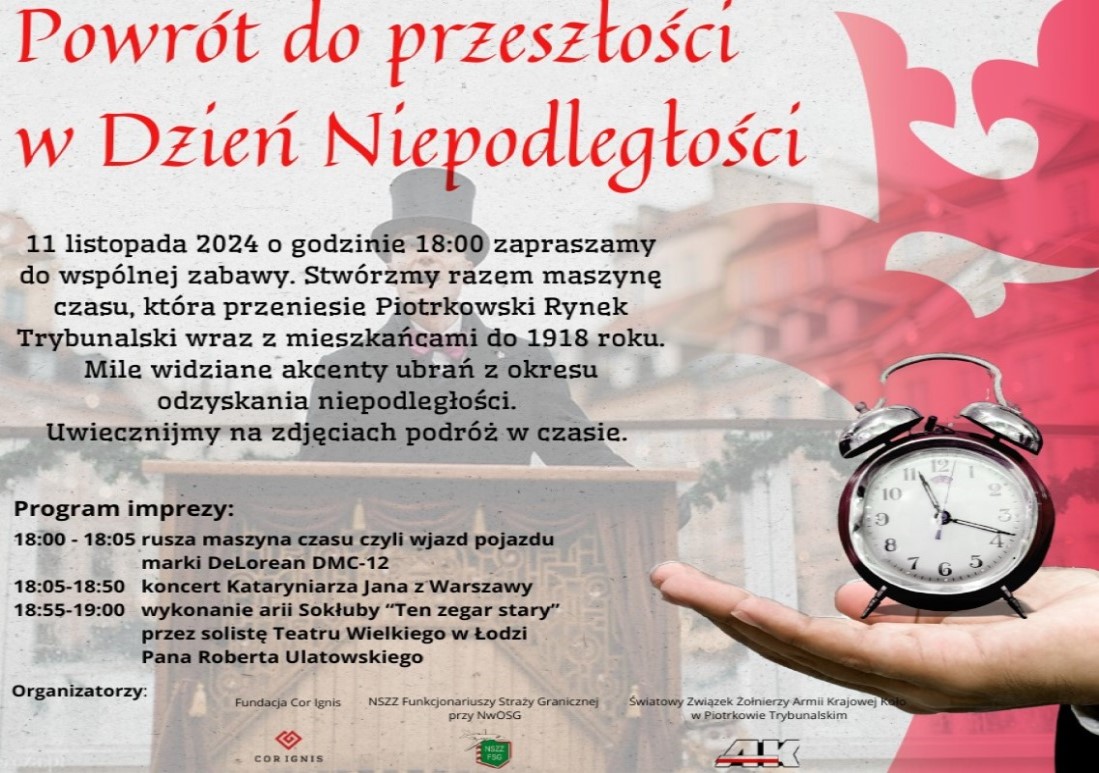 11 listopada 2024 o godzinie 18:00 zapraszamy do wspólnej zabawy. Stwórzmy razem maszynę czasu, która przeniesie Piotrkowski Rynek Trybunalski wraz z mieszkańcami do 1918 roku. Mile widziane akcenty ubrań z okresu odzyskania niepodległości.