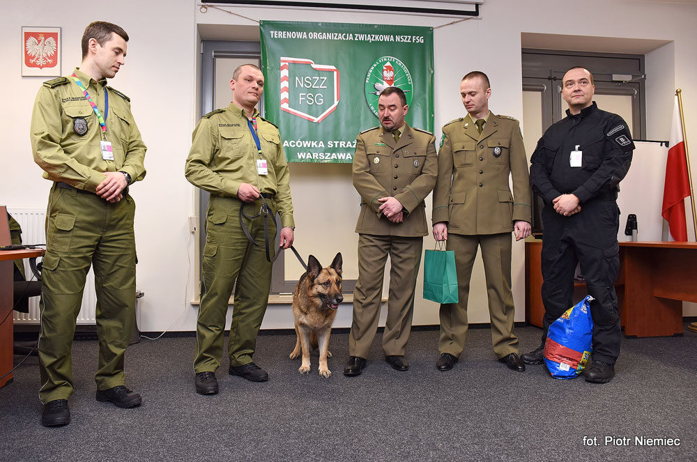 Nasza zasłużona suczka razem ze swoim opiekunem Robertem Dowiedczykiem przyjęła gości w sali konferencyjnej placówki. Na skromne pożegnanie przybyli goście z Oddziału Nadwiślańskiego z wydziału prezydialnego oraz przedstawiciele władz związkowych. Jako pierwszy głos zabrał Przewodniczący ZO NSZZ FSG przy NwOSG kol. Robert Lis, który pogratulował zasłużonej emerytury oraz wręczył nowiutką skórzaną obrożę ze smyczą i tabliczką identyfikującą psa.