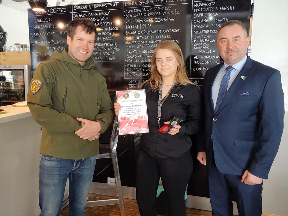 W podziękowaniu za wsparcie naszych akcji Koordynator Oddziału Klubu HDK Legion przy NwOSG Robert Lis wraz z Wiceprzewodniczącym ZT NSZZ FSG przy PSG Modlin Tomaszem Śpiewakiem wręczyli przedstawicielce restauracji BestFly pamiątkową monetę Oddziału oraz serdeczne podziękowania.