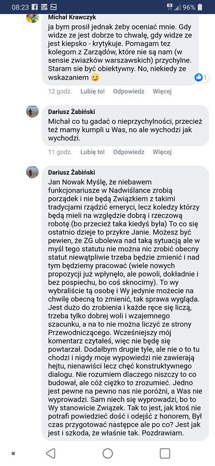 Jeśli według pana Żabińskiego, takie zachowanie przystoi oficerowi starszemu, piastującemu eksponowane stanowisko funkcyjne w Związku, to już jest jego sprawa. Ja, będąc administratorem publicznego profilu, funkcjonującego z upoważnienia kierowanej przeze mnie organizacji oddziałowej, nie zamierzam tolerować tego rodzaju sytuacji.