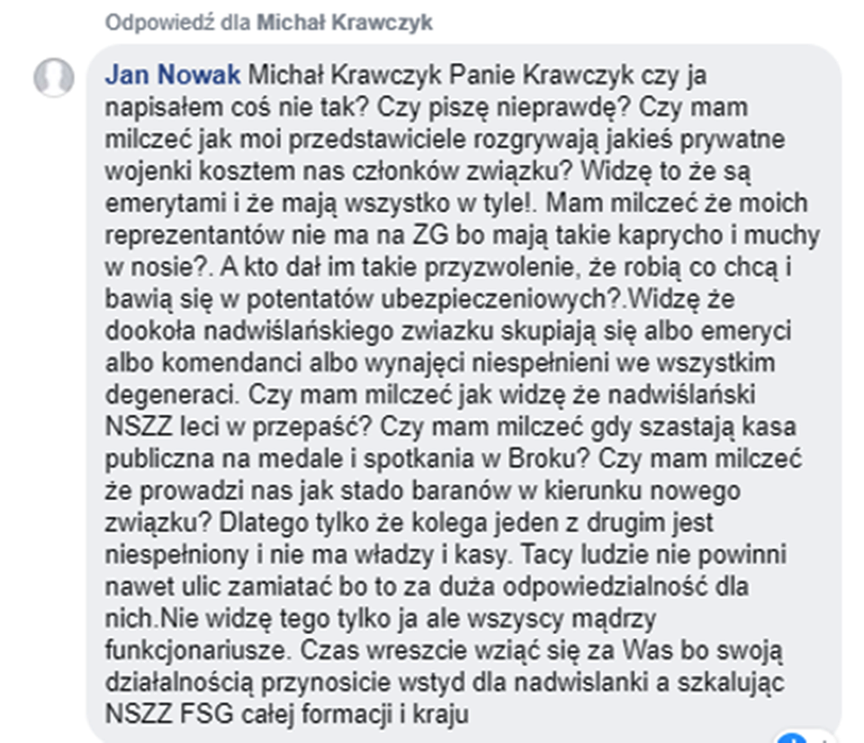 Sugeruje on we wpisie, że jest „zbuntowanym” związkowcem, zrzeszonym w ogniwach podległych ZO przy NwOSG. Osoba o takich personaliach nie figuruje na liście członków NSZZ FSG w zarządzanej przeze mnie organizacji oddziałowej.