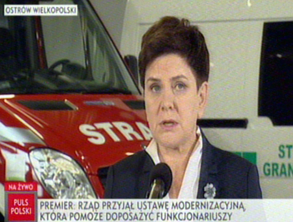 Trwa wizyta Beaty Szydło w Wielkopolsce. W Ostrowie Wielkopolskim premier wręczyła wyróżnienia funkcjonariuszom służb podległych MSWiA. W swoim wystąpieniu transmitowanym w TVP INFO premier Beata Szydło poinformowała o przyjęciu przez Rząd projektu ustawy modernizacyjnej.