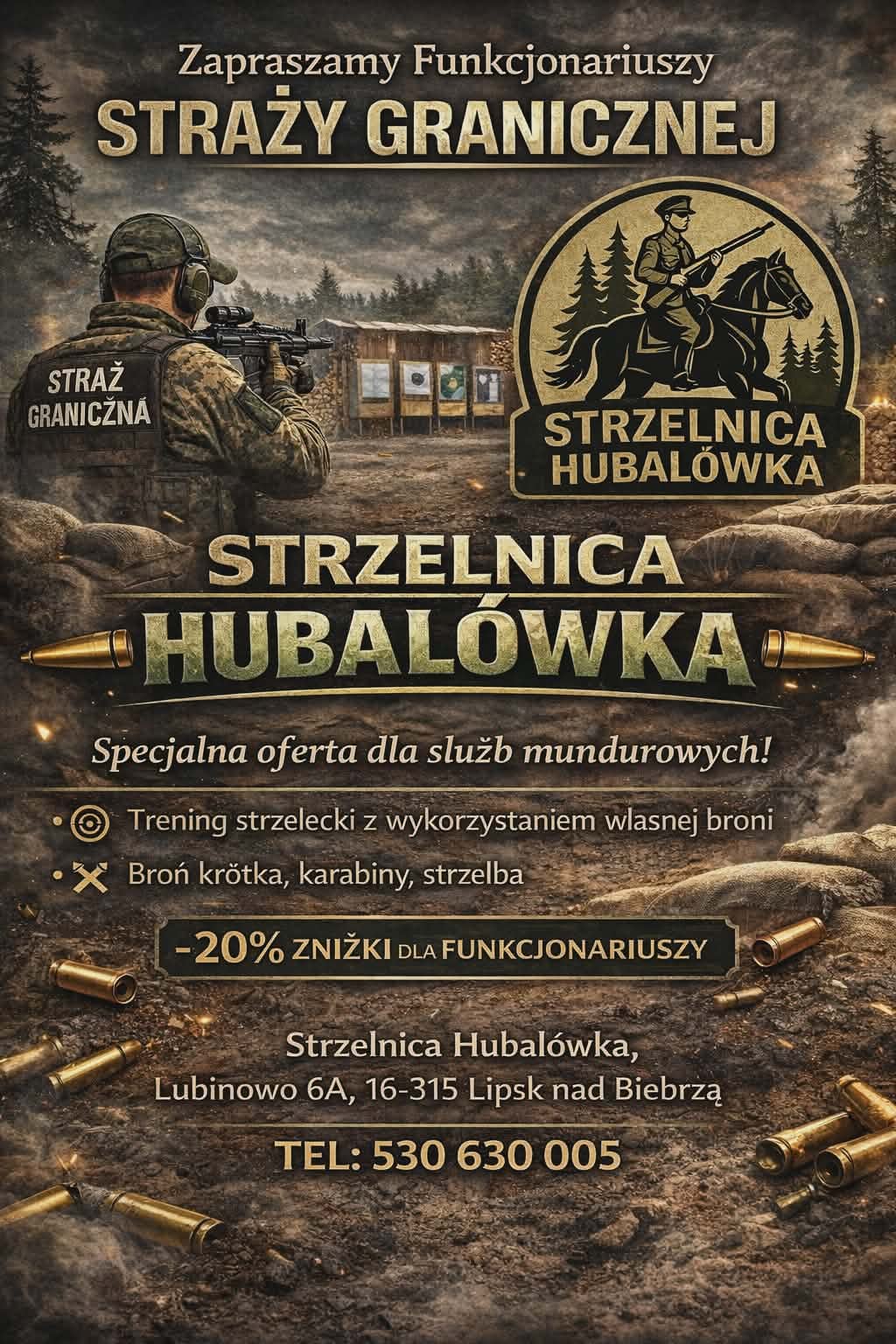 W przypadku organizacji zawodów, strzelań indywidualnych i grupowych należy kontaktować telefonicznie – 530 630 005.