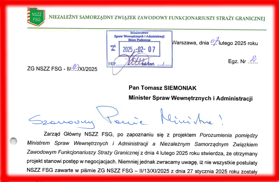 Przedstawiamy uwagi Zarządu Głównego NSZZ FSG do drugiego projektu porozumienia z MSWiA z dnia 4 lutego 2025 roku zamieszczone na stronie głównej nszzfsg.pl