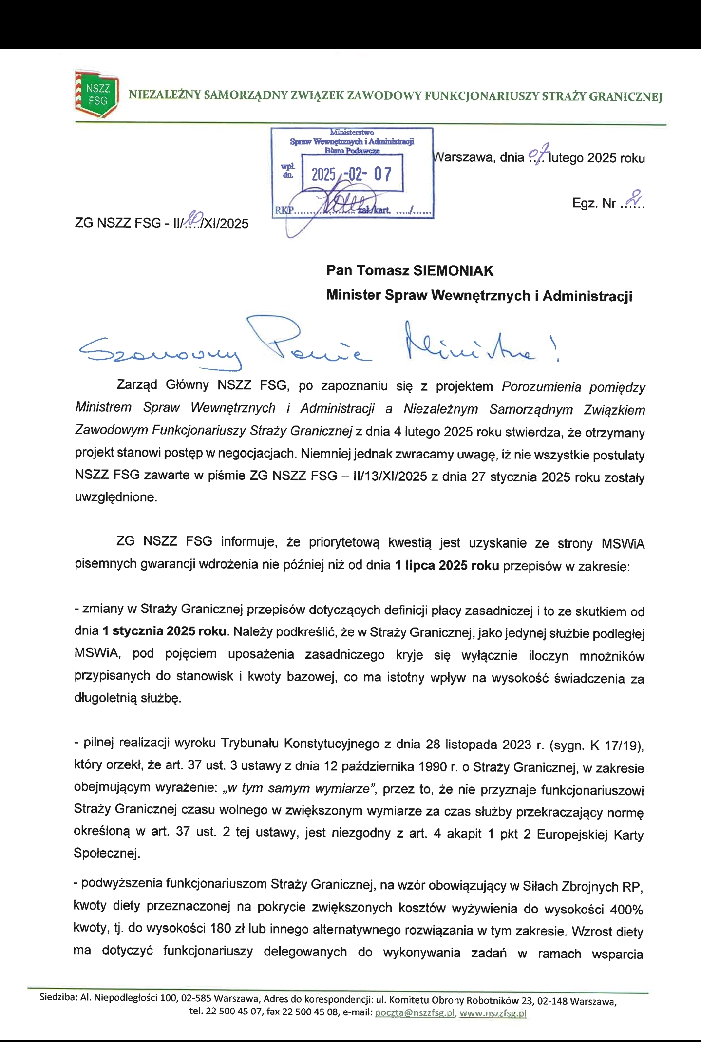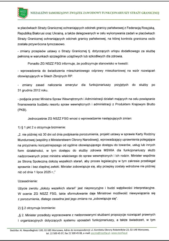 Przedstawiamy uwagi Zarządu Głównego NSZZ FSG do drugiego projektu porozumienia z MSWiA z dnia 4 lutego 2025 roku zamieszczone na stronie głównej nszzfsg.pl