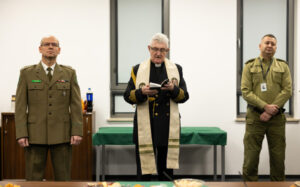 W dalszej części uroczystego spotkania głos zabrał Kapelan NwOSG ks. ppłk SG Ryszard Preuss, który odczytał fragment z Pisma Świętego, poświęcił stół z wigilijnymi potrawami po czym zainicjował wspólne śpiewanie kolęd.