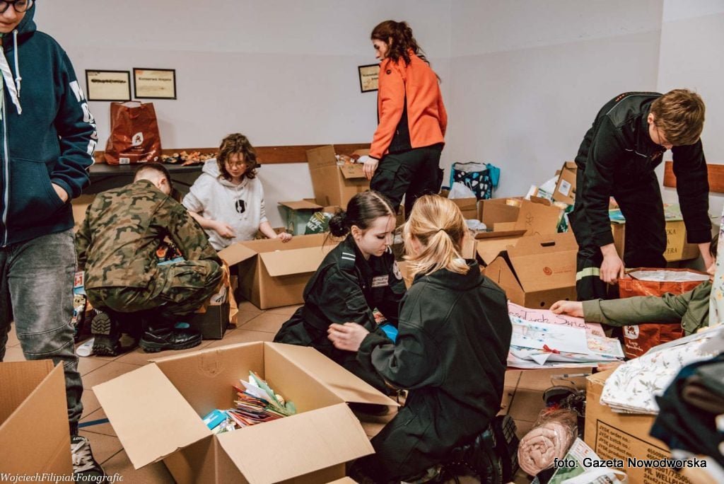 W remizie Ochotniczej Straży Pożarnej w Nowym Dworze Mazowieckim swoje dary przekazywali uczniowie zaangażowanych w akcję szkół, lokalnych firm, organizacji i przedstawicieli samorządów oraz przedstawiciele PSG w Modlinie i Zarządu Oddziałowego NSZZ FSG przy NwOSG.