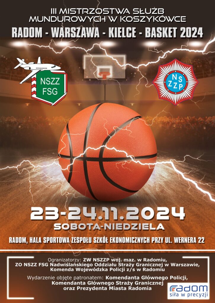 Zarząd Wojewódzki Niezależnego Samorządnego Związku Zawodowego Policjantów Województwa Mazowieckiego w Radomiu wspólnie z Zarządem Oddziałowym NSZZ FSG przy Nadwiślańskim Oddziale Straży Granicznej oraz Komedą Wojewódzką Policji z/s w Radomiu w dniach 23-24 listopada 2024 r. organizuje III Turniej Służb Mundurowych w Koszykówce „RADOM-WARSZAWA-KIELCE-BASKET 2024”.