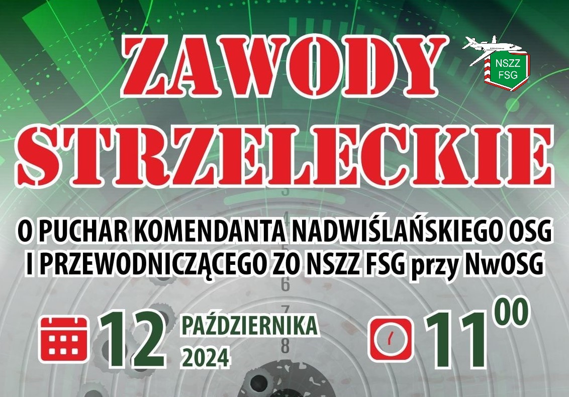 Zapraszamy funkcjonariuszy i pracowników NwOSG na Zawody Strzelecki o Puchar Komendanta Nadwiślańskiego Oddziału Straży Granicznej i Przewodniczącego ZO NSZZ FSG przy NwOSG, które odbędą się 12 października br. na Strzelnicy “9” w Józefowie.