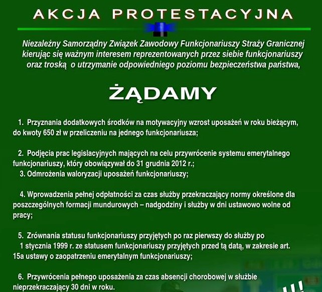Po pierwsze. Niezrozumiała opieszałość MSWiA i brak podpisania porozumienia gwarantującego realizację żądań skierowanych przez Federację w dniu 12 marca 2018 roku, Po drugie. Nie zgadzamy się z tym aby funkcjonariusze Straży Granicznej mieli niskie uposażenia, a w SG była największa ilość wakatów. Nie chcemy aby ze służby odchodzili doświadczeni i profesjonalnie wyszkoleni funkcjonariusze z uwagi na występujące dysproporcje w wysokości uposażeń w MSWiA i MON. Nie chcemy aby uposażenia funkcjonariuszy Straży Granicznej były niższe niż w Straży Marszałkowskiej, SOP, MON i innych służbach specjalnych. Nie chcemy, aby funkcjonariusze Straży Granicznej ponosili negatywne konsekwencje z tytułu liczebności formacji, bądź innych nieznanych i niezrozumiałych dla nas powodów.