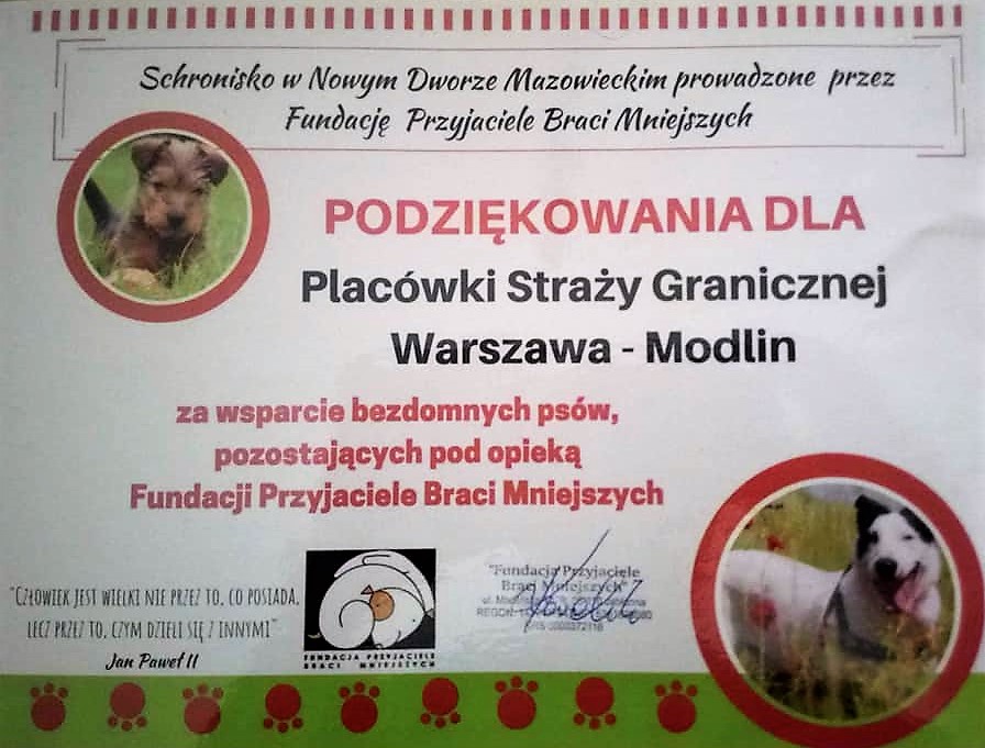 W dniu 16 stycznia 2019 roku przedstawiciele Zarządu Terenowego NSZZ FSG przy PSG Warszawac-Modlin złożyli wizytę w schronisku dla zwierząt prowadzonym przez Fundacje Przyjaciele Braci Mniejszych w Nowym Dworze Mazowieckim. W trakcie wizyty przekazali zebraną karmę, koce i inne niezbędne przedmioty. Działacze fundacji przekazali podziękowania dla wszystkich darczyńców za ich dobre serca, licząc na dalsze wsparcie. Pomoc dla porzuconych Braci Mniejszych jest niezbędna, zwłaszcza w okresie zimowym potrzebne są koce, maty i budy.